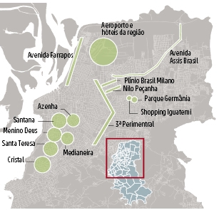 ESTRATÉGIA DA BM já está nas ruas. O mapa de Porto Alegre foi assinalado com três cores, que identificam as necessidades de policiamento de cada área a partir da distância do estádio e concentração de público esperada