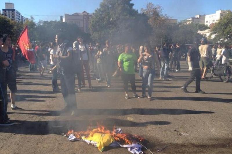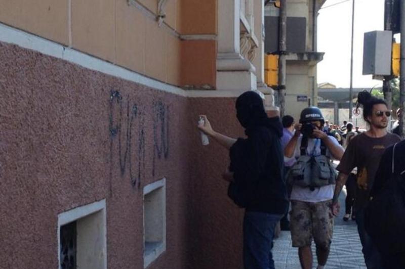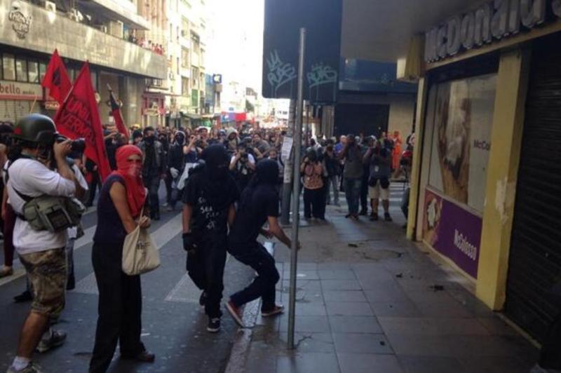 Após se concentrarem em frente ao Paço Municipal, manifestantes saíram em caminhada pelas ruas de Porto Alegre, em protesto contra a realização da Copa do Mundo no Brasil. A marcha se iniciou por volta das 13h30min e passou por ruas do Centro Histórico, como Júlio de Castilhos e Salgado Filho, e da Cidade Baixa. Prédios públicos e privados foram pichados e tiveram as vidraças apedrejadas.